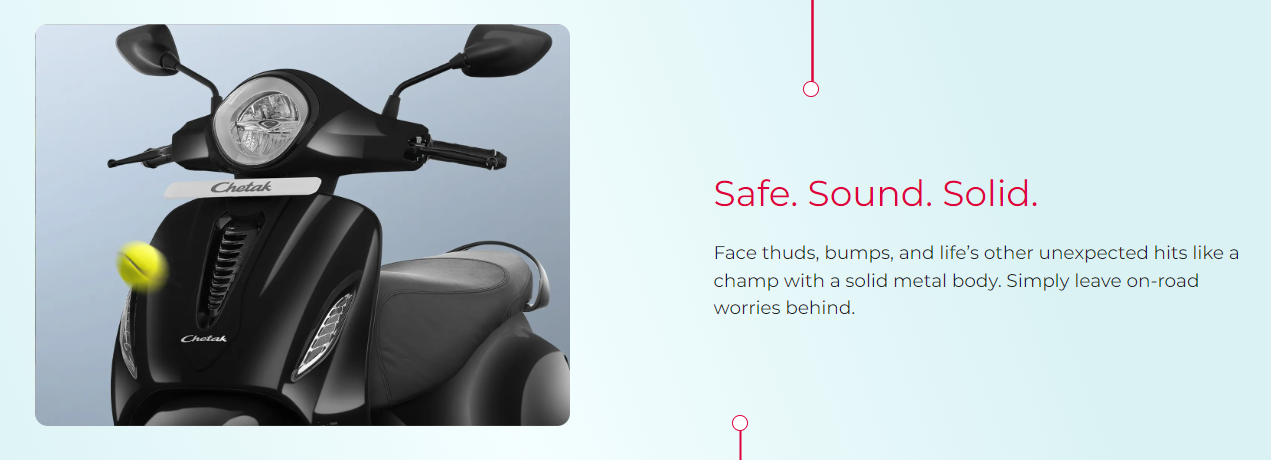 While designing the Chetak, safety of the rider and vehicle is of paramount consideration. There have been conscious choices made at every step to ensure a safe & incident-free ownership experience.